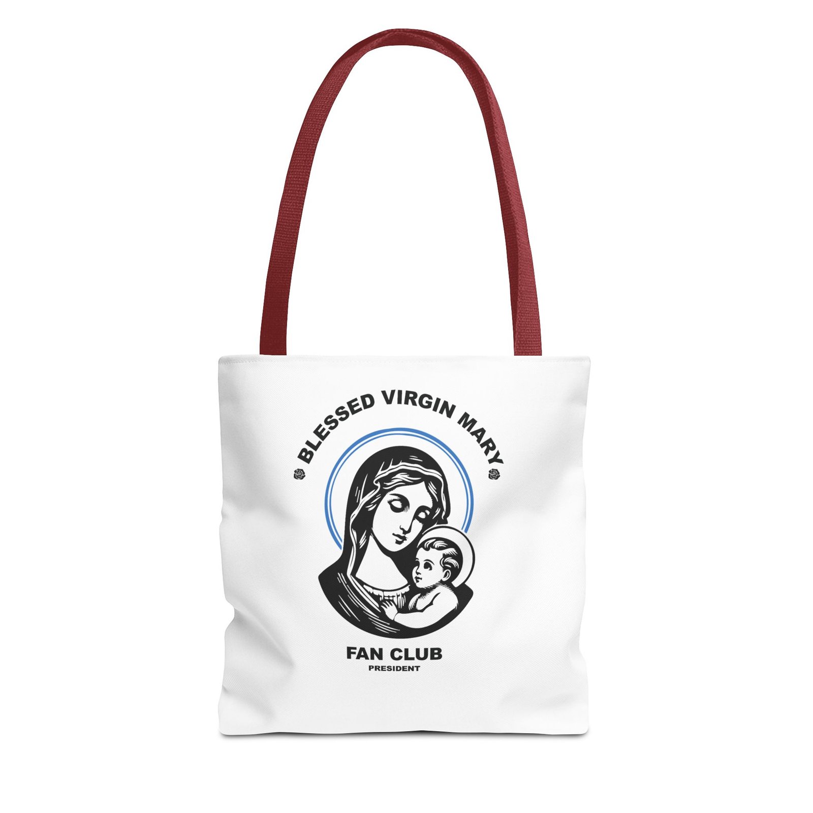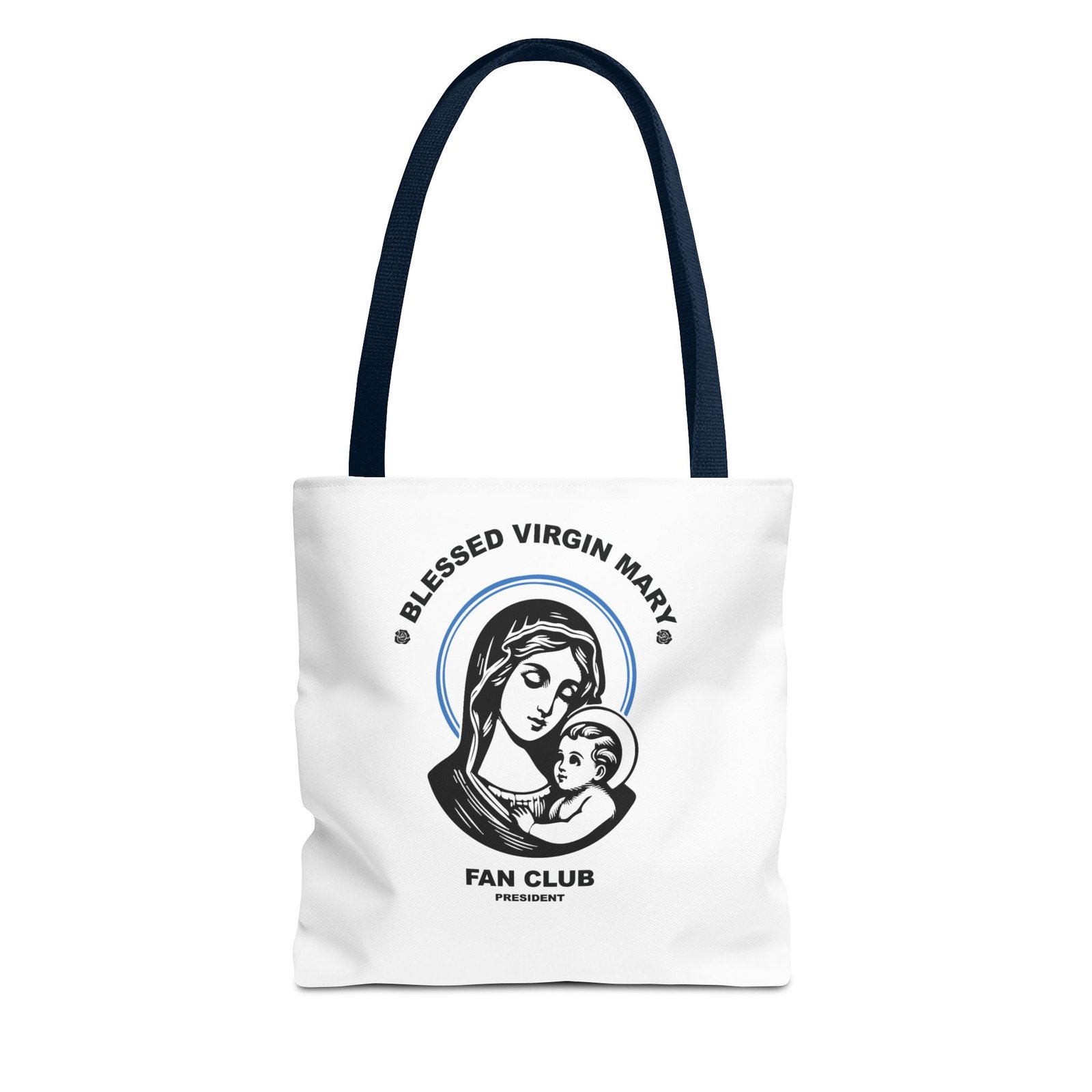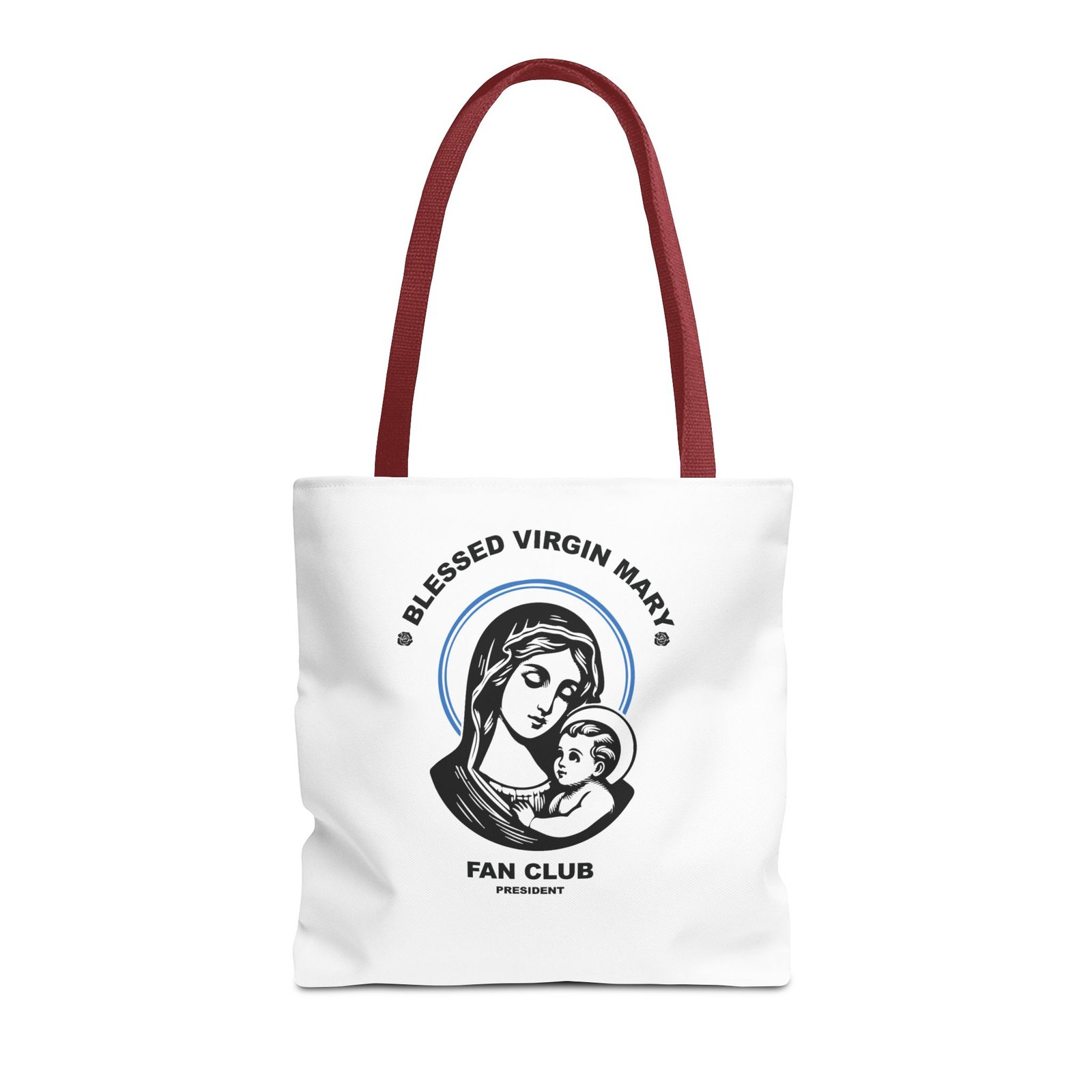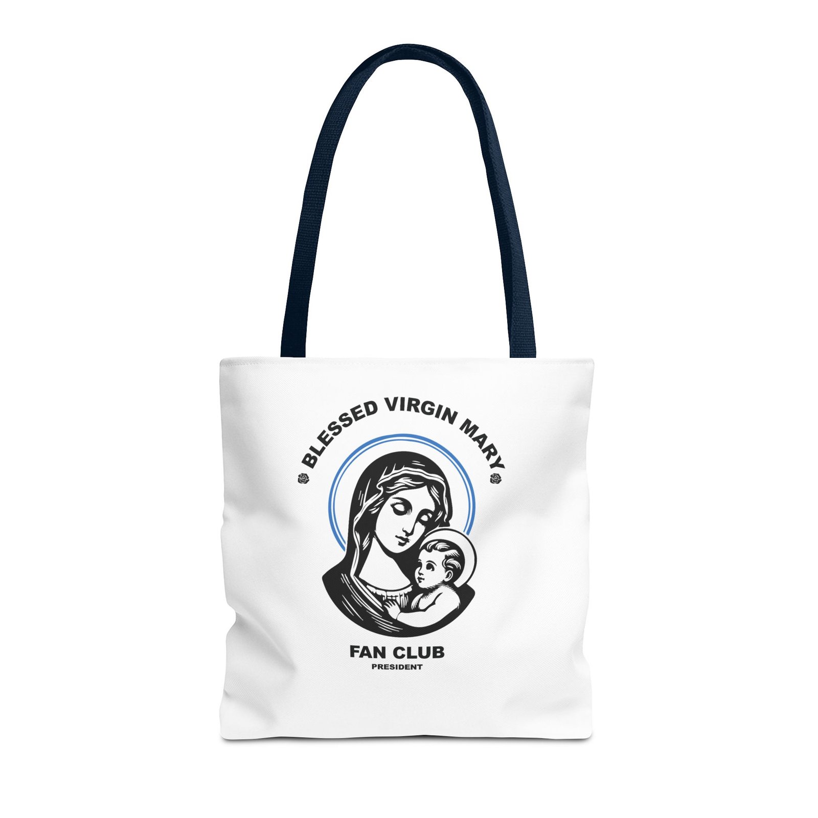 Available in 3 sizes to add both functionality and style, President of the Blessed Virgin Mary Fan Club tote bags come with multiple handle colors to match your designs. Show your devotion and fandom to our Lady, the Blessed Mother of our Lord and Savior Jesus Christ. Made with spun polyester, these bags feature double-stitched seams, cotton webbing straps, and nonwoven laminate lining for high-end durability. Your all-over print is created with dye sublimation for high-end visuals.