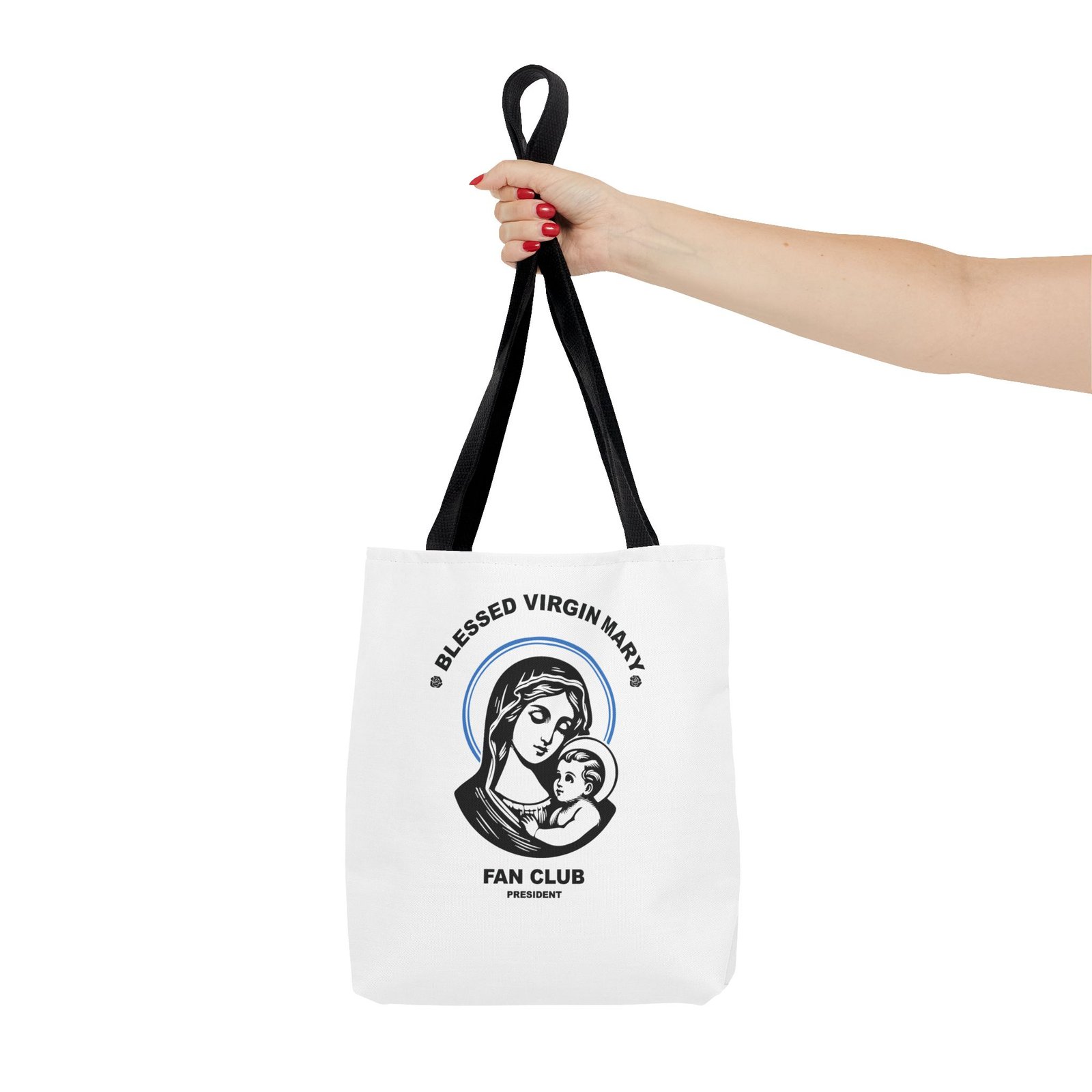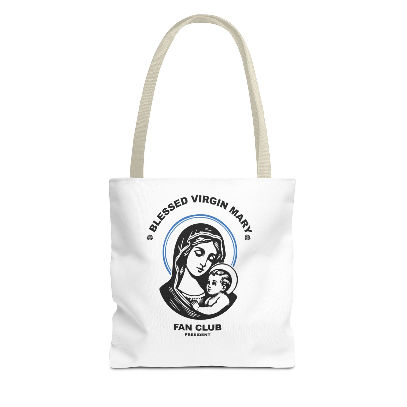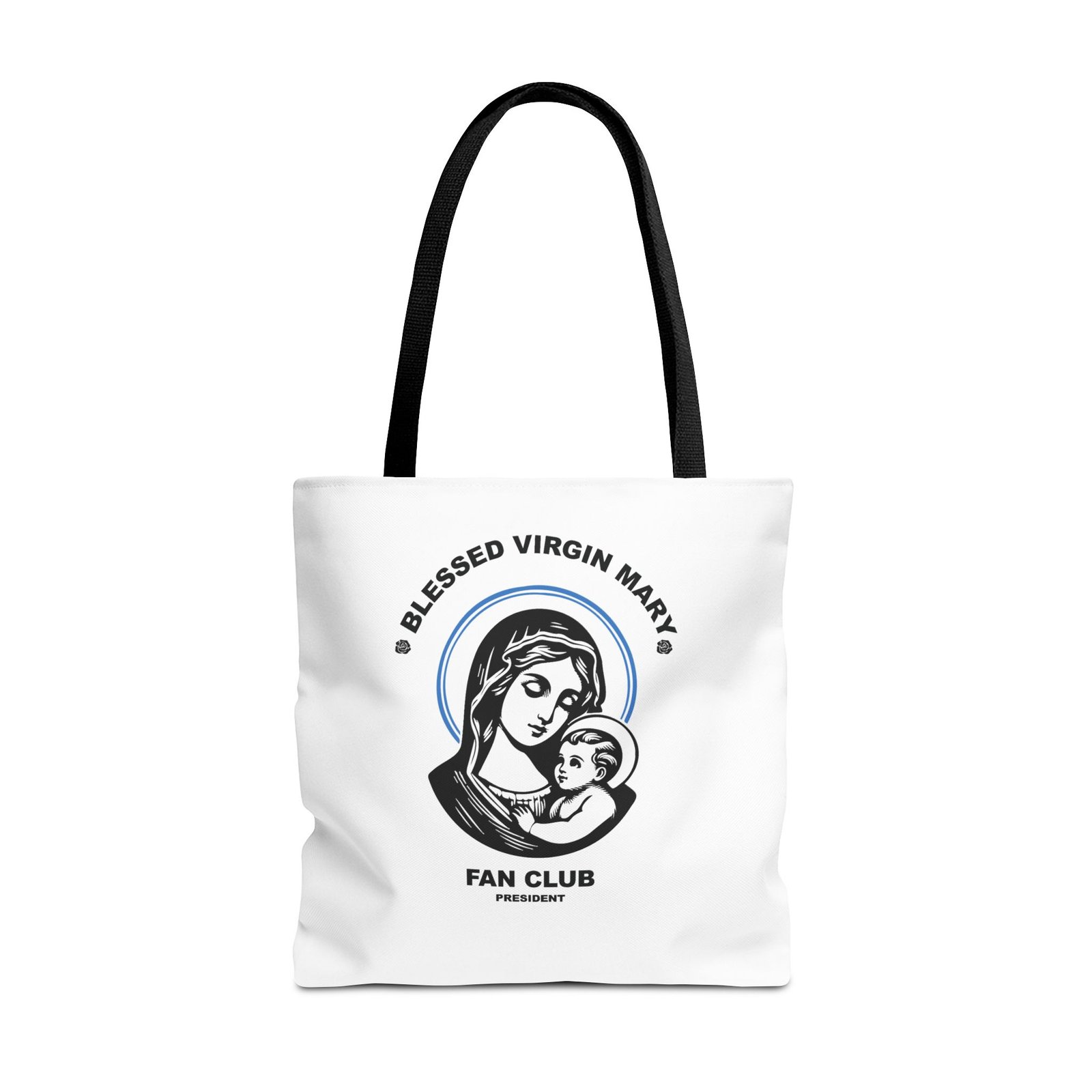 Available in 3 sizes to add both functionality and style, President of the Blessed Virgin Mary Fan Club tote bags come with multiple handle colors to match your designs. Show your devotion and fandom to our Lady, the Blessed Mother of our Lord and Savior Jesus Christ. Made with spun polyester, these bags feature double-stitched seams, cotton webbing straps, and nonwoven laminate lining for high-end durability. Your all-over print is created with dye sublimation for high-end visuals.