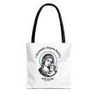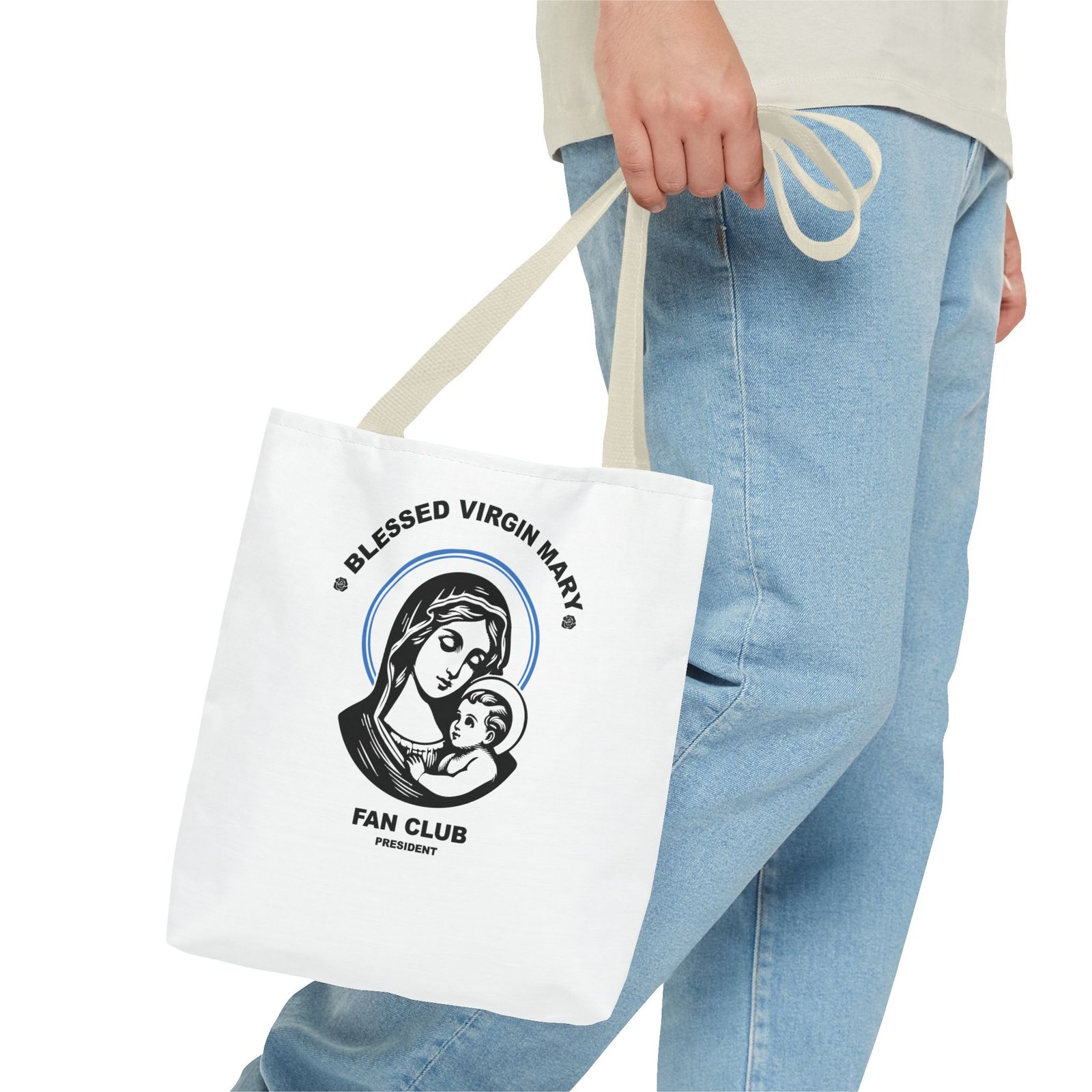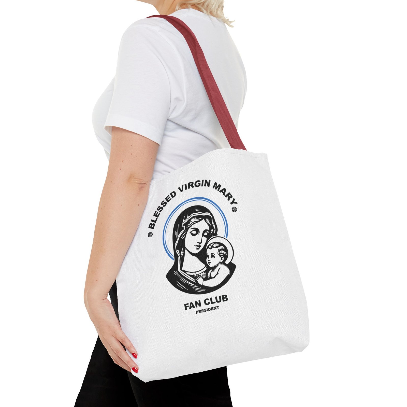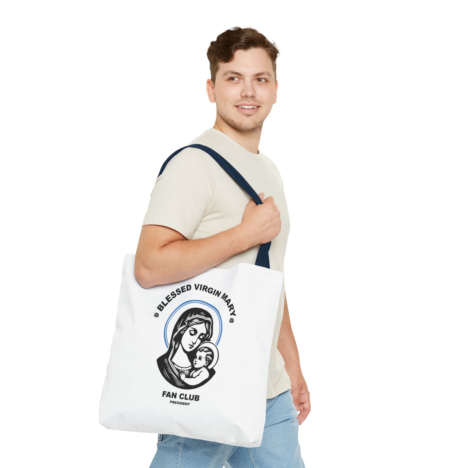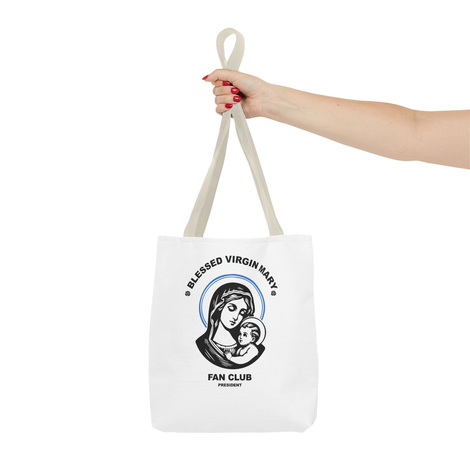 Available in 3 sizes to add both functionality and style, President of the Blessed Virgin Mary Fan Club tote bags come with multiple handle colors to match your designs. Show your devotion and fandom to our Lady, the Blessed Mother of our Lord and Savior Jesus Christ. Made with spun polyester, these bags feature double-stitched seams, cotton webbing straps, and nonwoven laminate lining for high-end durability. Your all-over print is created with dye sublimation for high-end visuals.