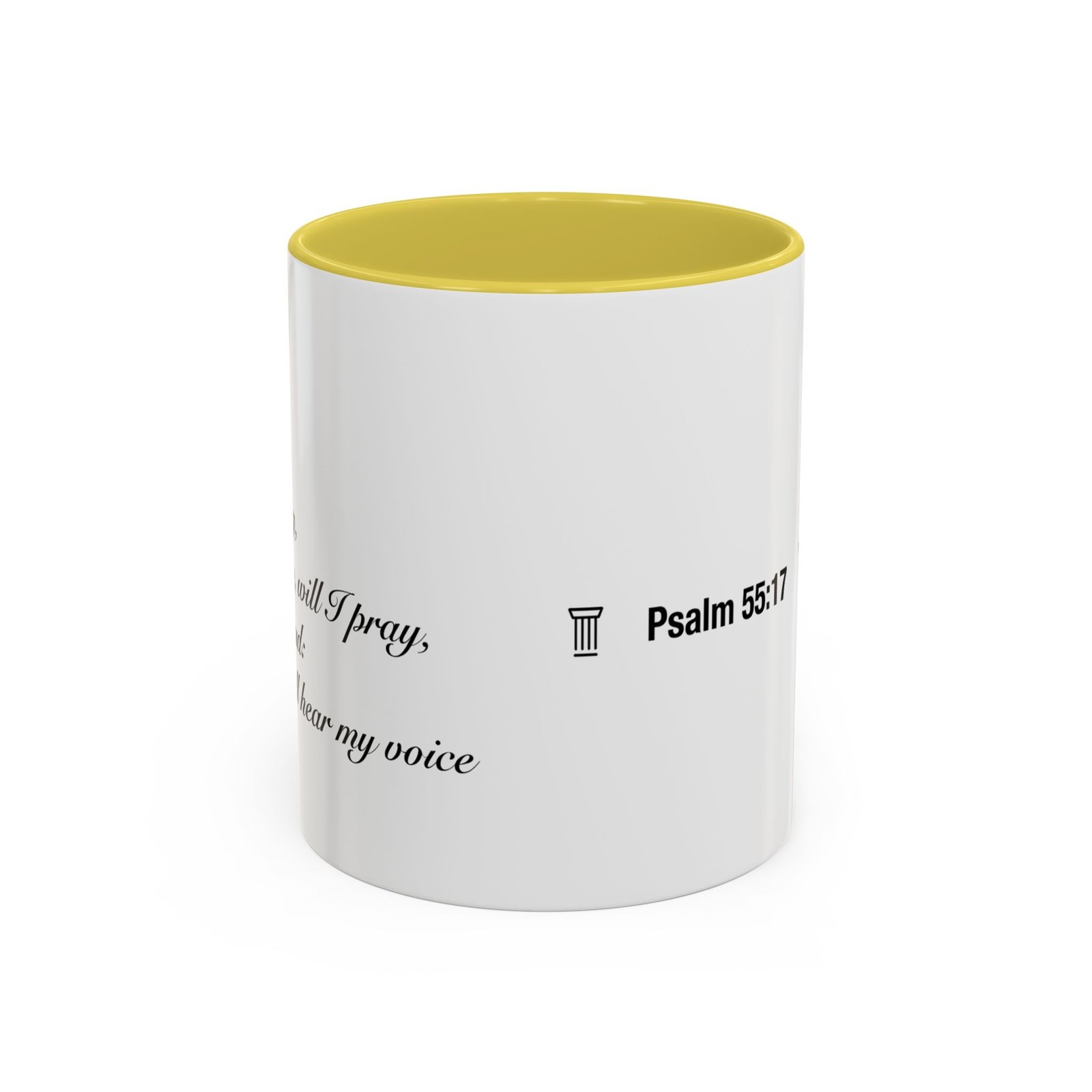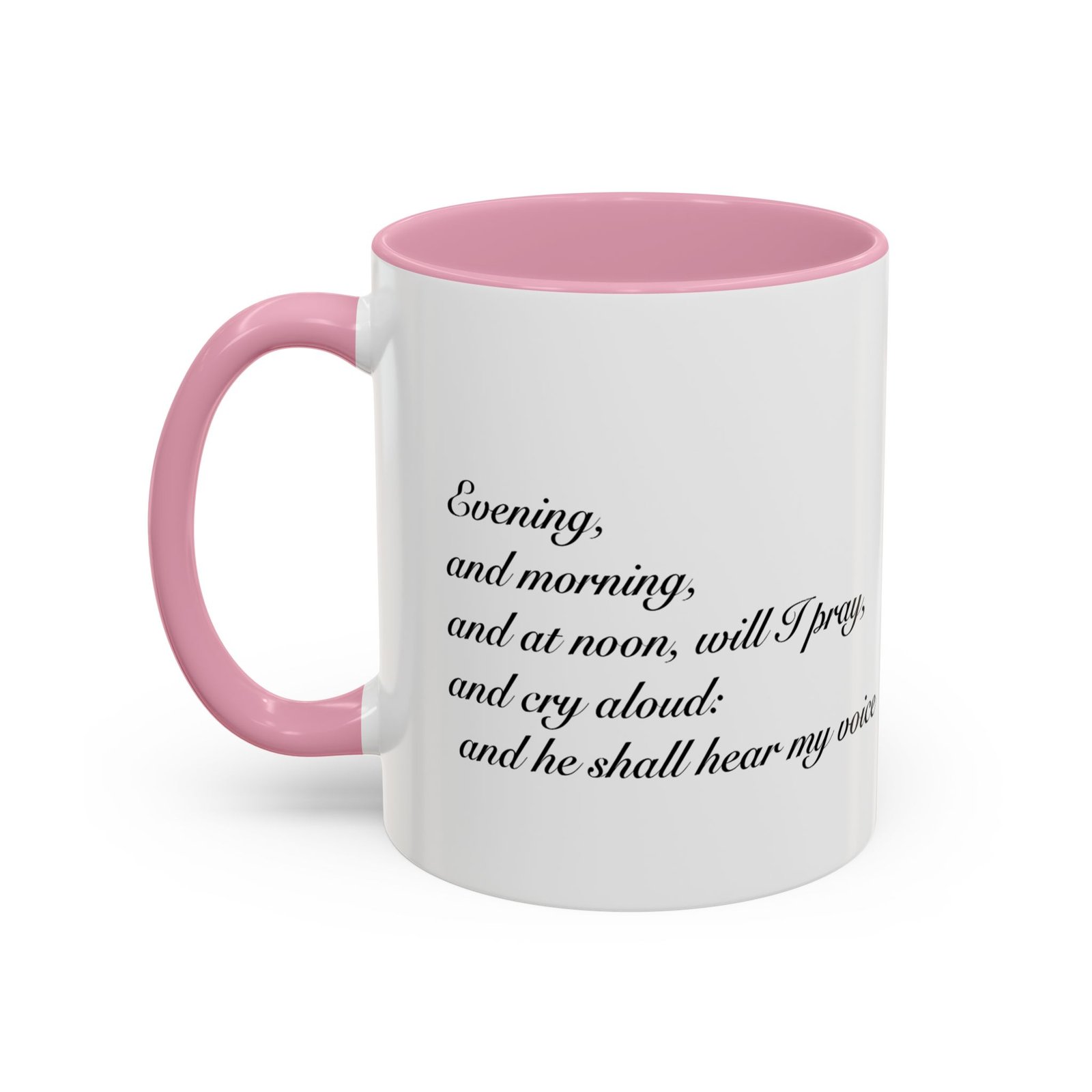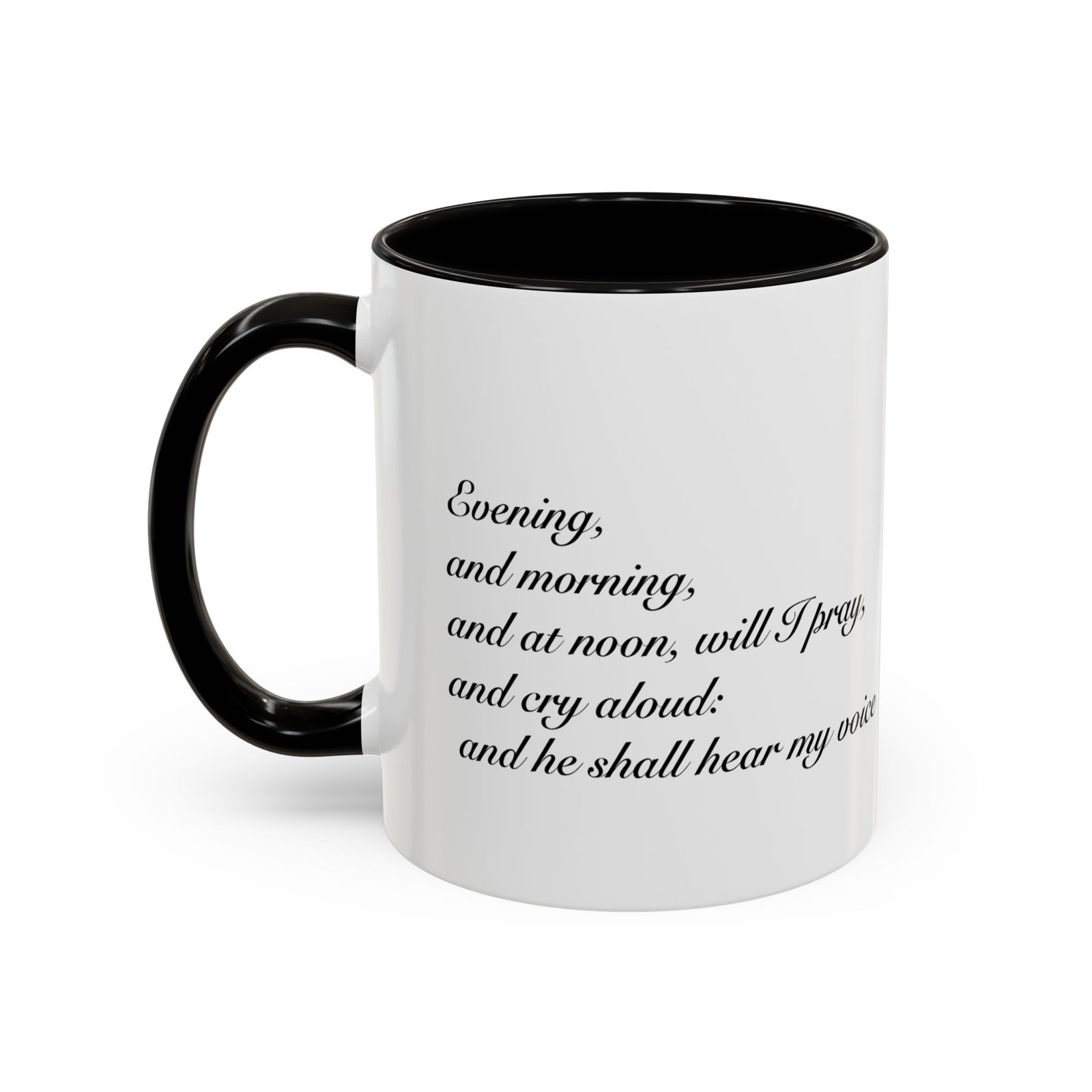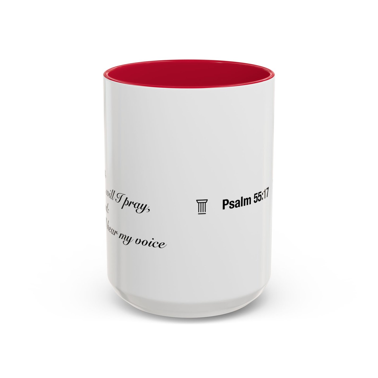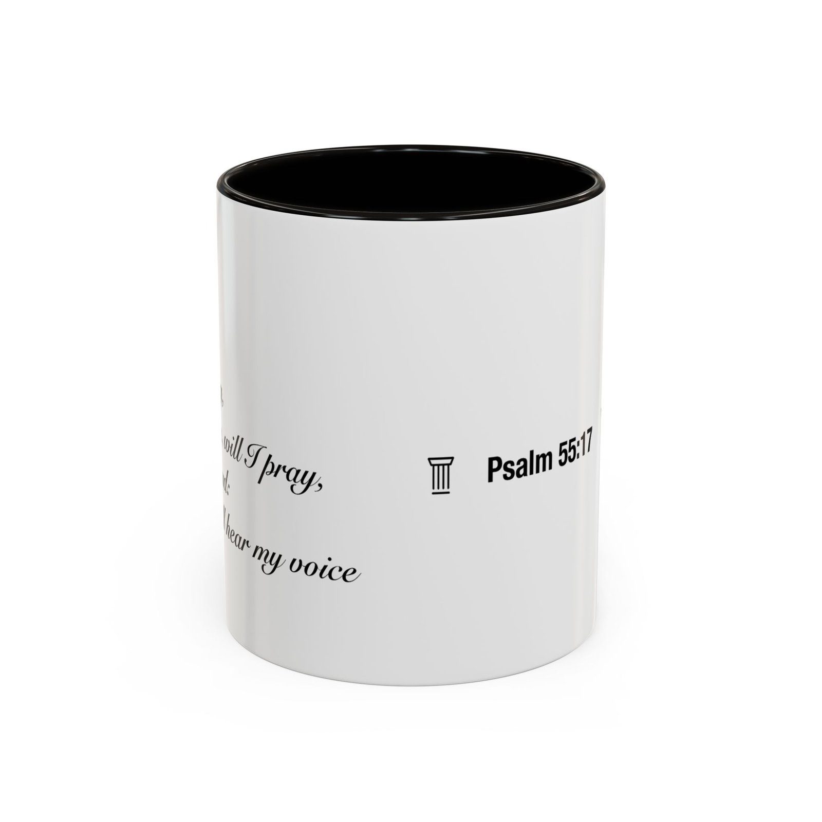 A comforting, everyday mug that carries a quiet promise. Smooth glossy ceramic blooms with crisp printing and a chosen accent color on the handle and interior. The subtle scripture reference "Evening and morning and at noon I will pray, and cry aloud, And He shall hear my voice- Psalm 55:17" and minimal iconography sit like a gentle reminder on the rim of your morning routine — a small moment of stillness before the day begins. It feels warm in the hand thanks to the easy-grip C-handle, and holds either a humble 11oz cup of coffee or a generous 15oz pour for slower sips. Durable and bright, this mug moves from kitchen counter to office desk without losing its shine, and the dishwasher- and microwave-safe finish keeps care simple so the message stays with you.