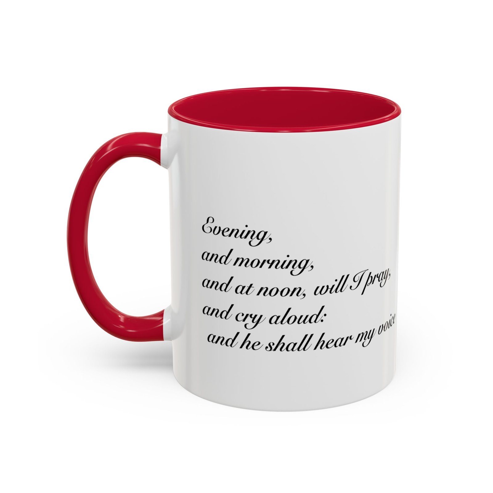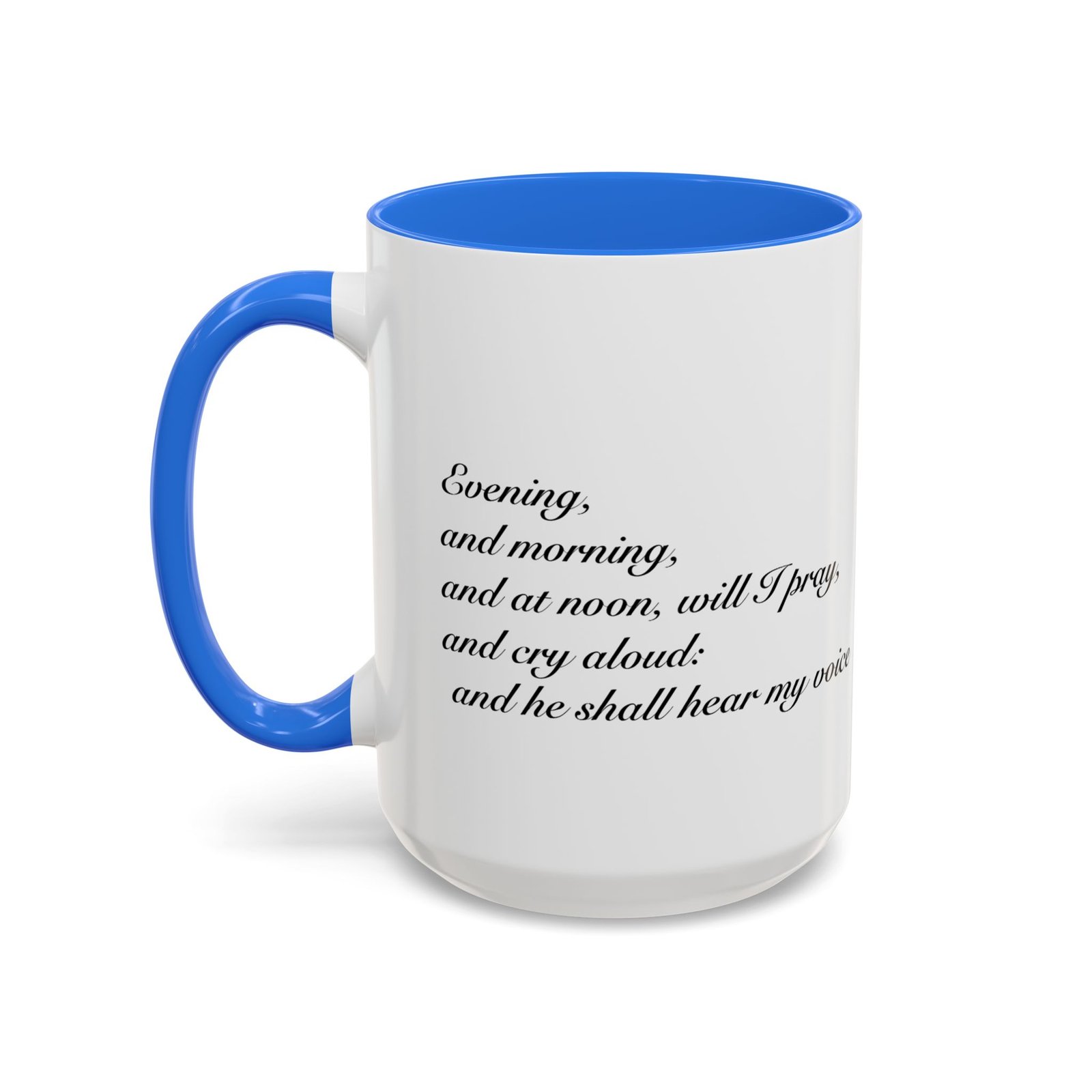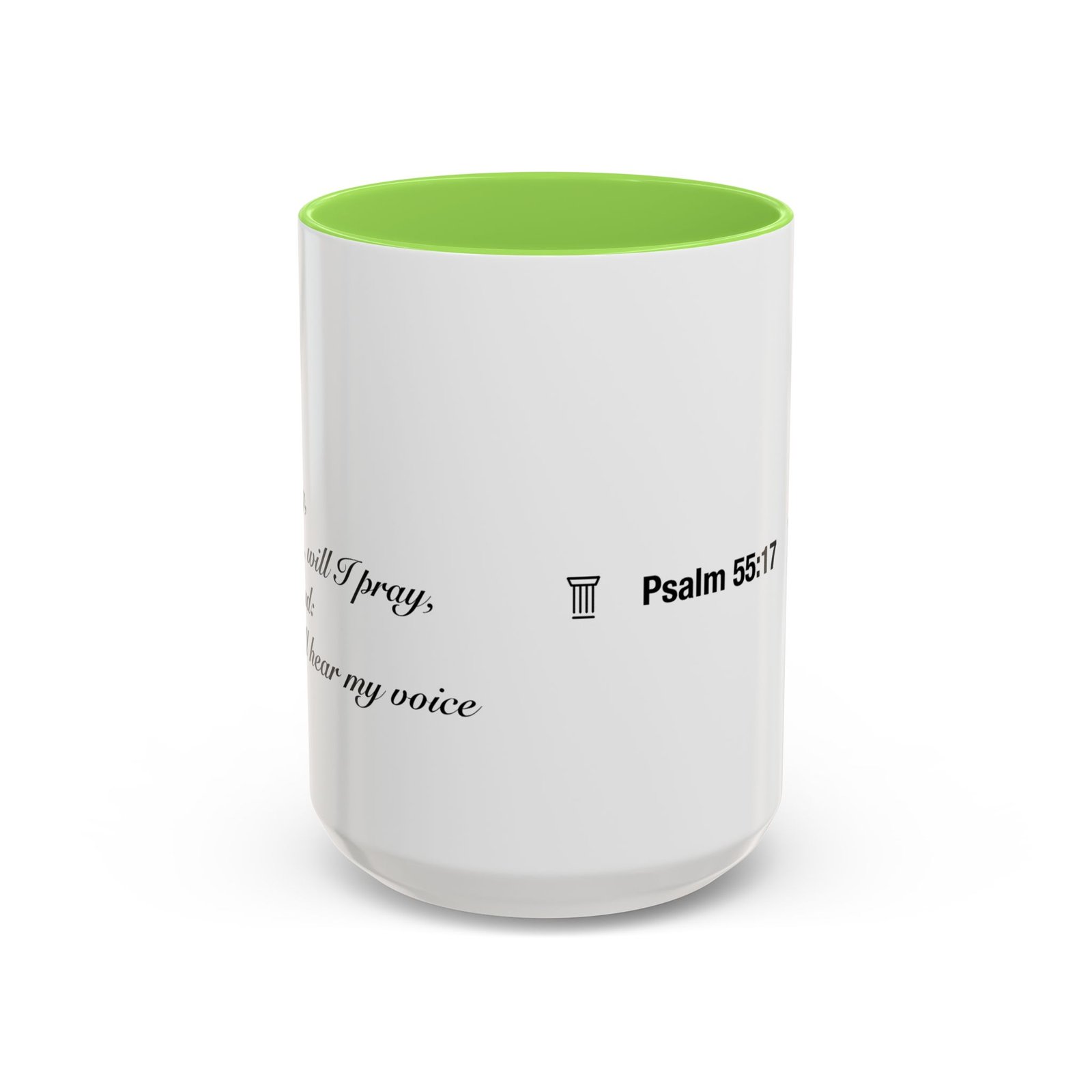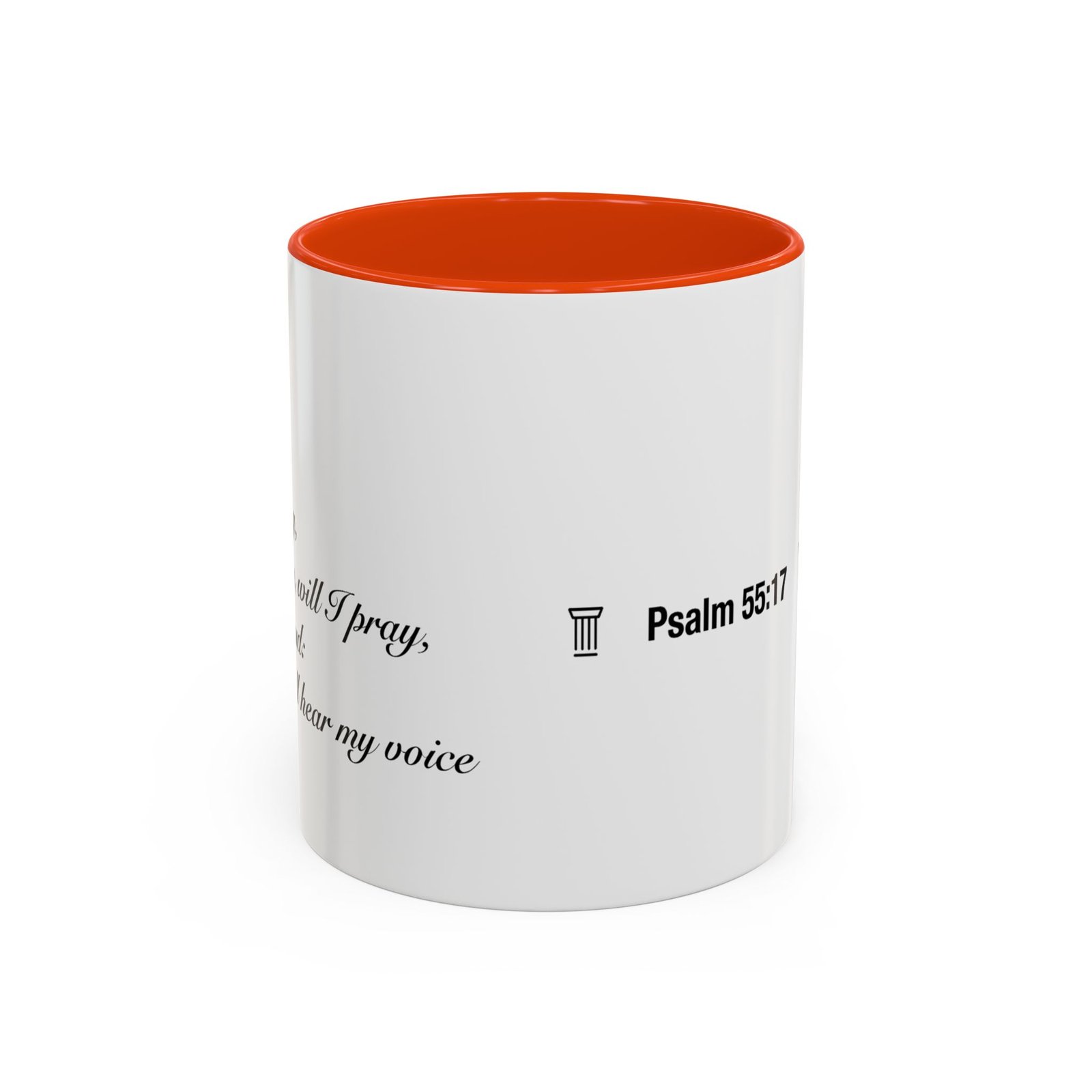 A comforting, everyday mug that carries a quiet promise. Smooth glossy ceramic blooms with crisp printing and a chosen accent color on the handle and interior. The subtle scripture reference "Evening and morning and at noon I will pray, and cry aloud, And He shall hear my voice- Psalm 55:17" and minimal iconography sit like a gentle reminder on the rim of your morning routine — a small moment of stillness before the day begins. It feels warm in the hand thanks to the easy-grip C-handle, and holds either a humble 11oz cup of coffee or a generous 15oz pour for slower sips. Durable and bright, this mug moves from kitchen counter to office desk without losing its shine, and the dishwasher- and microwave-safe finish keeps care simple so the message stays with you.
