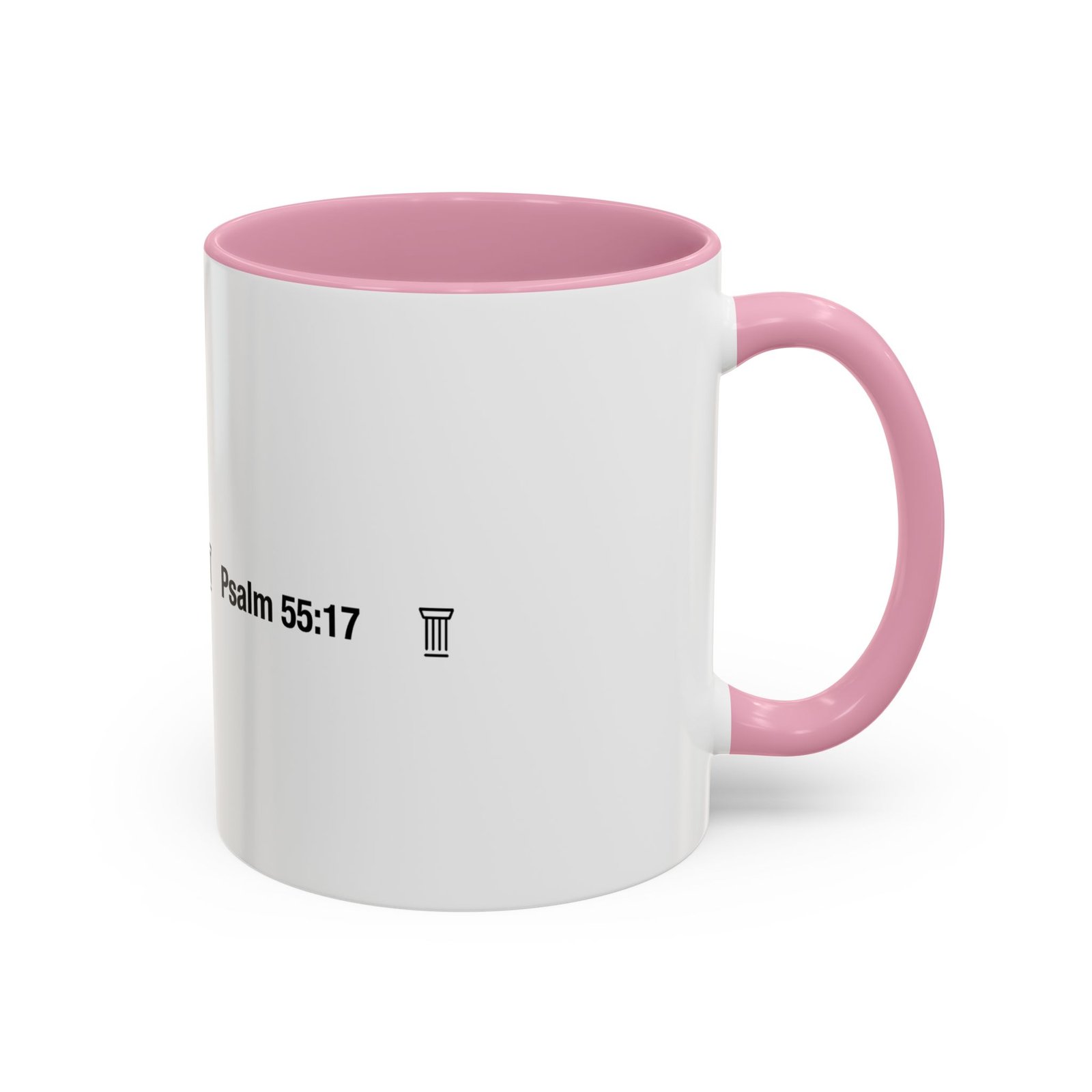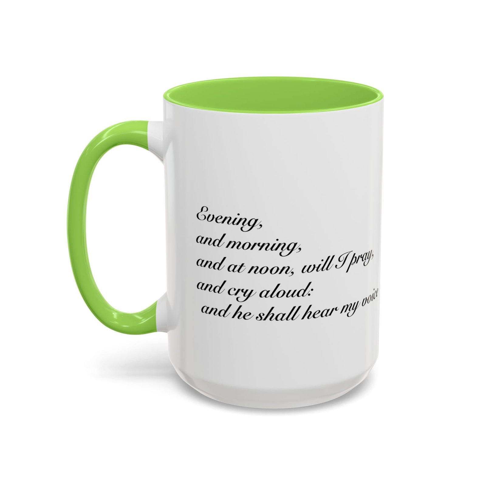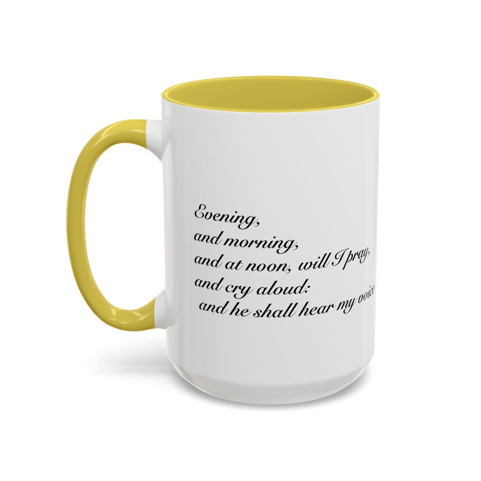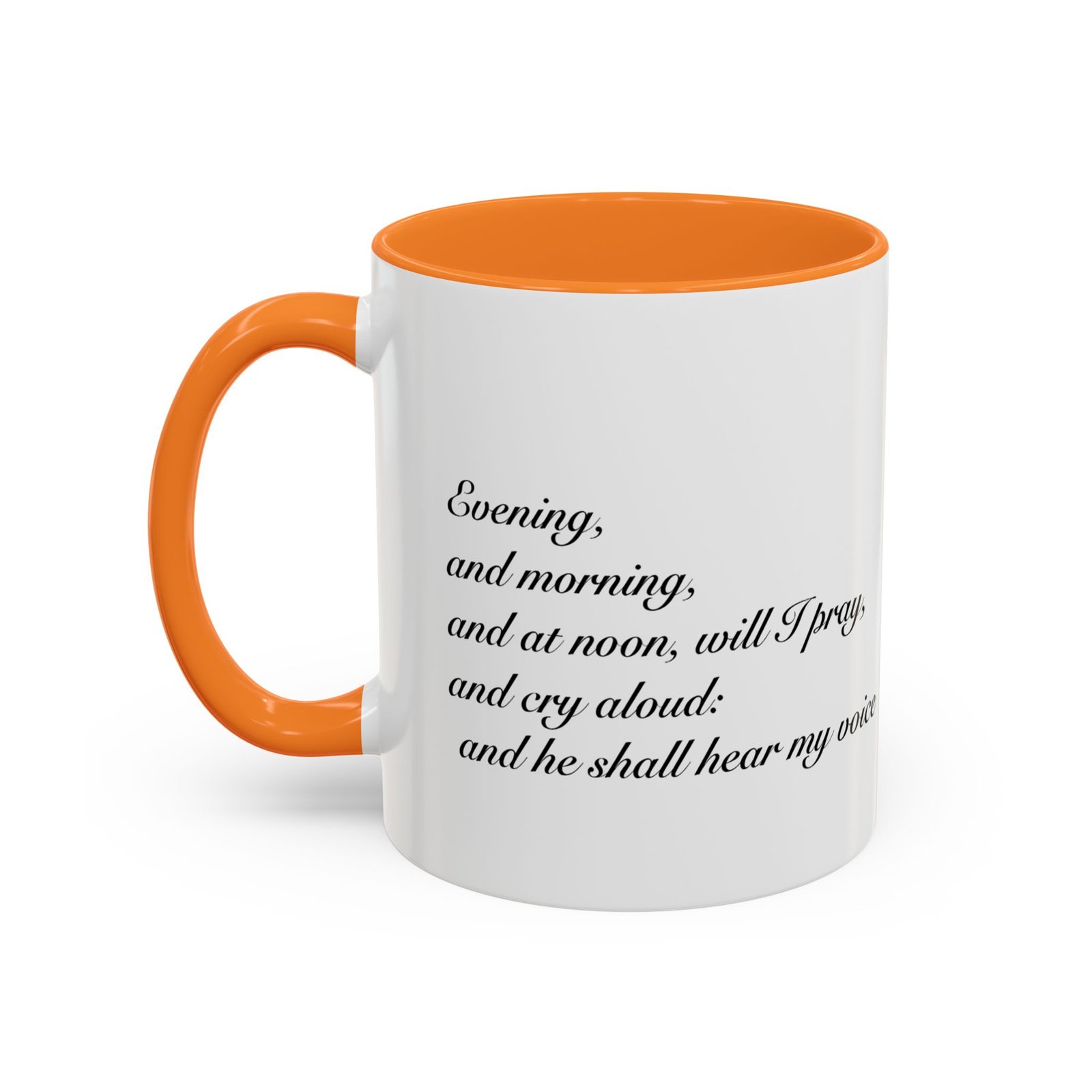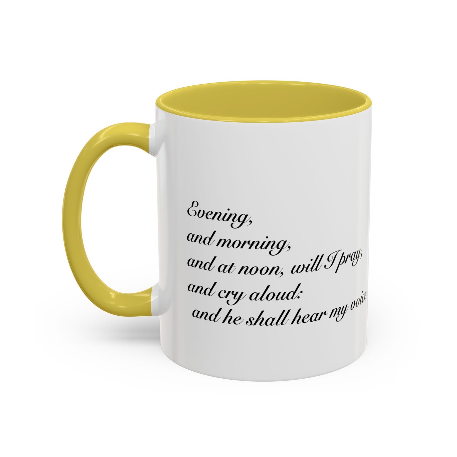 A comforting, everyday mug that carries a quiet promise. Smooth glossy ceramic blooms with crisp printing and a chosen accent color on the handle and interior. The subtle scripture reference "Evening and morning and at noon I will pray, and cry aloud, And He shall hear my voice- Psalm 55:17" and minimal iconography sit like a gentle reminder on the rim of your morning routine — a small moment of stillness before the day begins. It feels warm in the hand thanks to the easy-grip C-handle, and holds either a humble 11oz cup of coffee or a generous 15oz pour for slower sips. Durable and bright, this mug moves from kitchen counter to office desk without losing its shine, and the dishwasher- and microwave-safe finish keeps care simple so the message stays with you.